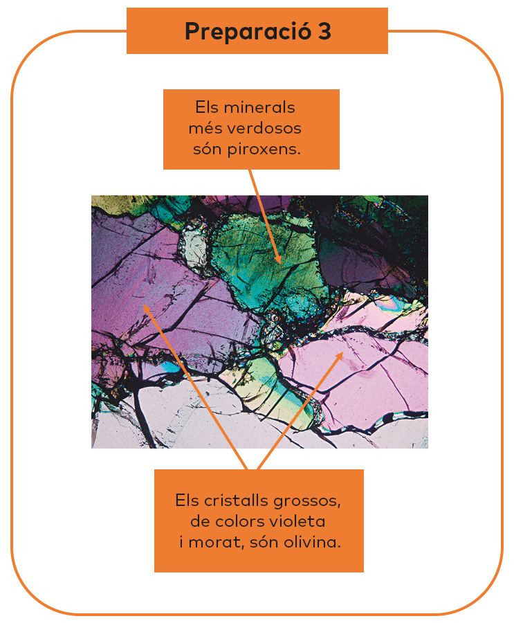 Mostra les fotografies de les roques i de les preparacions microscòpiques, i explica com has deduït quina correspon a l’escorça continental, a l’escorça oceànica i al mantell.