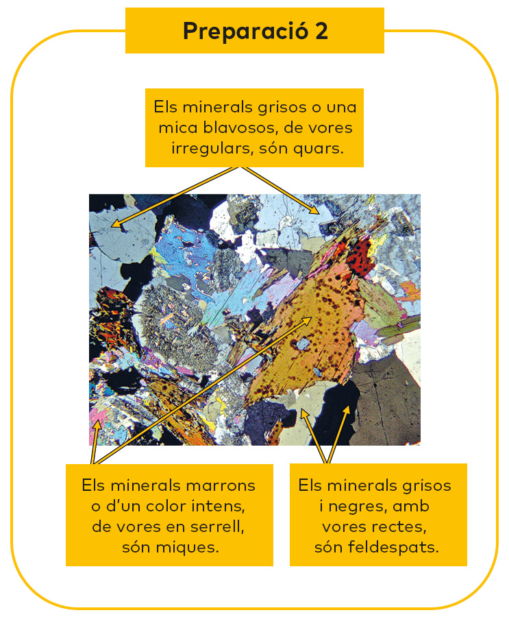 Ara que ja saps quins minerals té cada roca, i com reconèixer-les al microscopi, pots identificar les preparacions (1, 2 i 3).