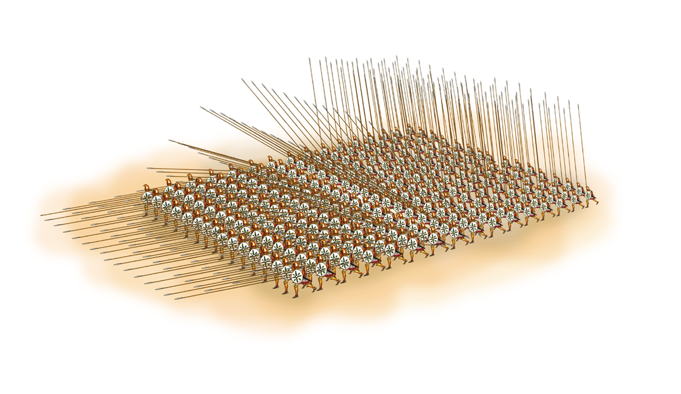 Una falange era una formació de combat organitzada en setze files amb setze homes a cadascuna, és a dir, amb un total de 256 soldats. D’aquestes setze files només sortien a atacar les cinc primeres. La resta aixecava les sarisses, una mena de llances, més llargues, per protegir els companys de davant i, quan era necessari, substituïen els soldats que havien caigut. D’aquesta manera, entre les sarisses i els escuts es creava una forma d’eriçó difícil d’atacar.