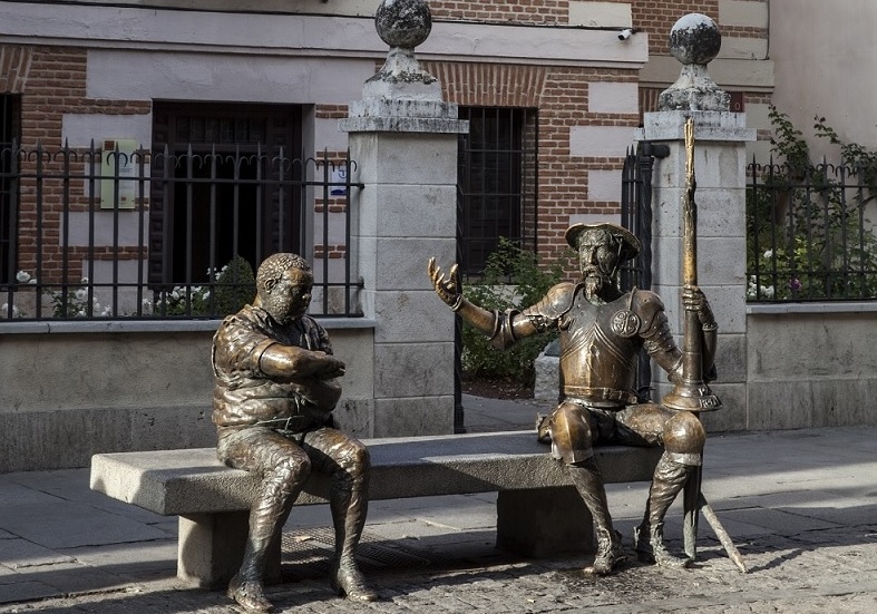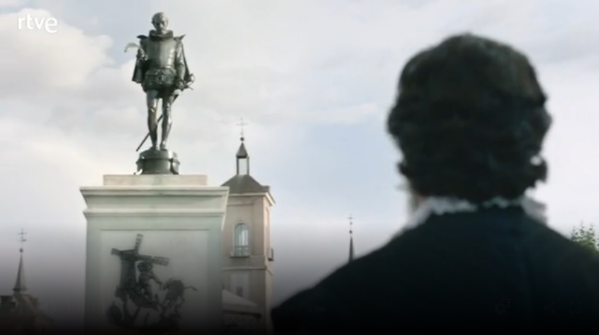 - Cervantes se emociona al pasear por Alcalá de Henares, su ciudad natal, y muestra sorpresa e incredulidad al reconocerse en una estatua que homenajea su figura y al ver las numerosas ediciones de su obra que llenan el escaparate de una librería.