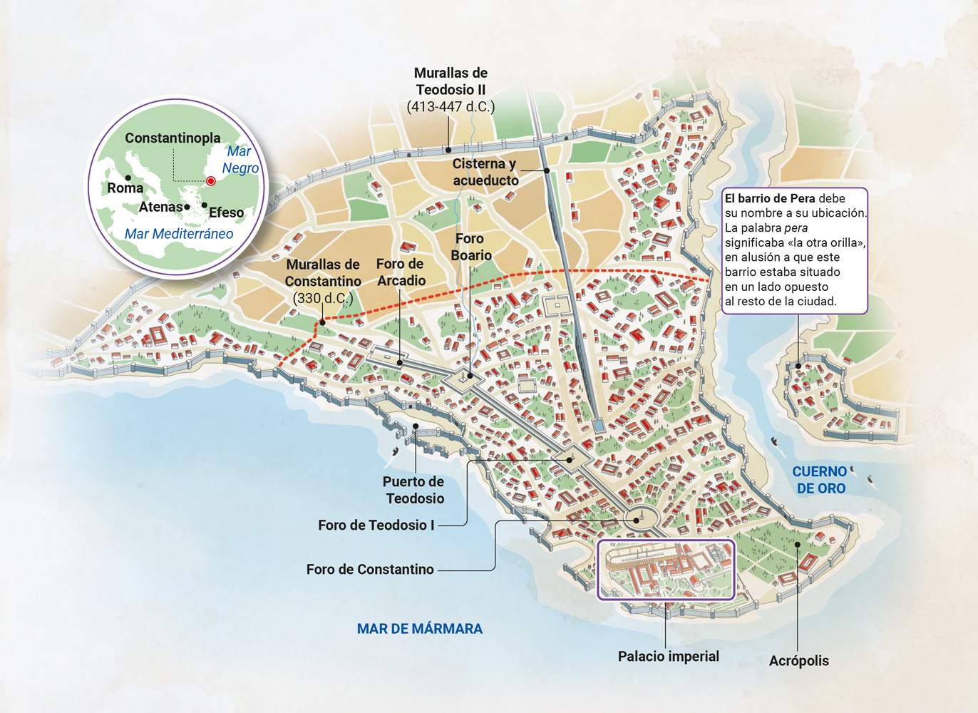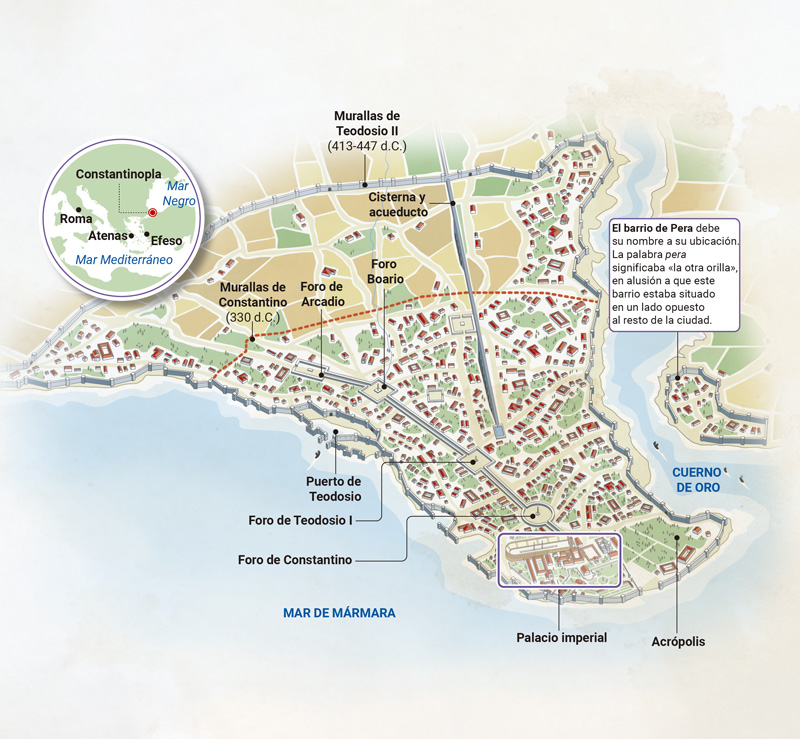 Constantinopla fue construida a imagen de Roma por el emperador Constantino en el año 330, sobre la antigua colonia griega de Bizancio.
