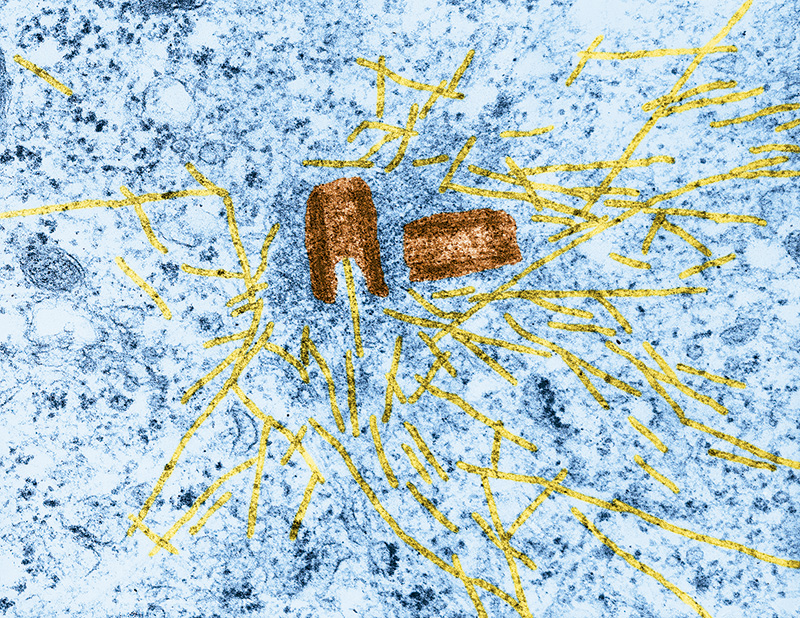 • El centrosoma está formado por dos cilindros perpendiculares de microtúbulos proteicos. Cada uno de estos cilindros se llama centriolo y participa en la motilidad celular, en la formación del citoesqueleto y en el proceso de división de la célula.