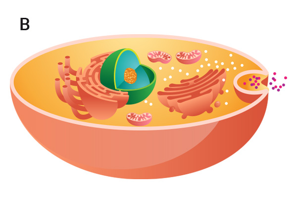 • El aparato de Golgi está compuesto por un conjunto de sáculos aplanados. A partir de él se emiten vesículas digestivas que contienen enzimas hidrolíticas llamadas lisosomas y vesículas de secreción con sustancias que serán expulsadas al exterior de la célula.